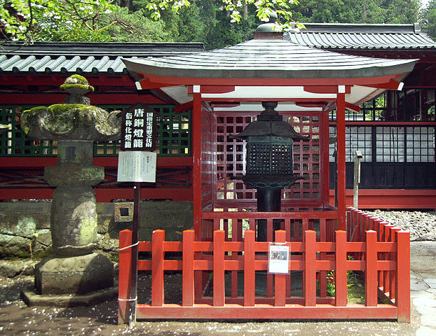 神苑を入って神輿舎を過ぎた右手、本殿の横に立つ2.3mの唐銅製、春日造りの灯籠です。その昔、夜更けに燈籠に火を灯すと、その様子が怪しげに見え、警護の武士たちが化け物と 度々間違えて切りつけることから化灯篭と呼ばれました。