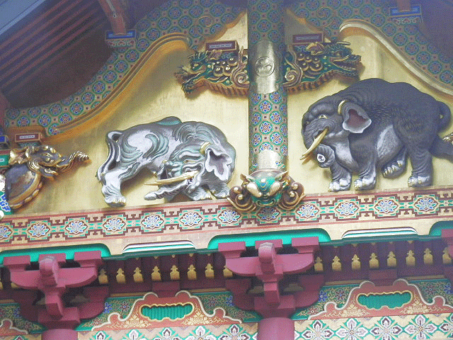 表門を入って、右から正面にかけて鉤手のように並ぶ校倉造りの三棟は、下・中・上の三神庫で祭器や渡御祭の装束が収められています。ここで見逃せないのが上神庫の妻にある「想像の象」です。