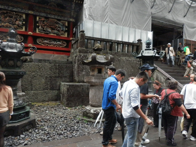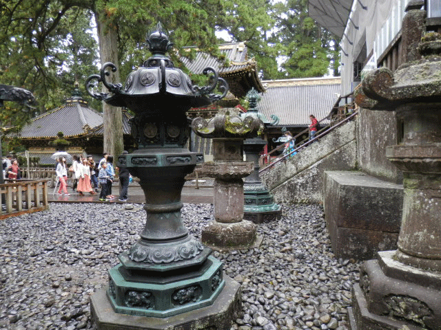オランダ東インド会社から奉納された八角形の大きな回り燈籠は三つ葉葵の紋が逆で「逆紋の回り灯籠」 と呼ばれています。一見の価値ありです。ポルトガルから鉄材を取り寄せて造らせたという南蛮鉄燈籠は、陽明門石段の右に二基あって伊達政宗が奉納致しました。