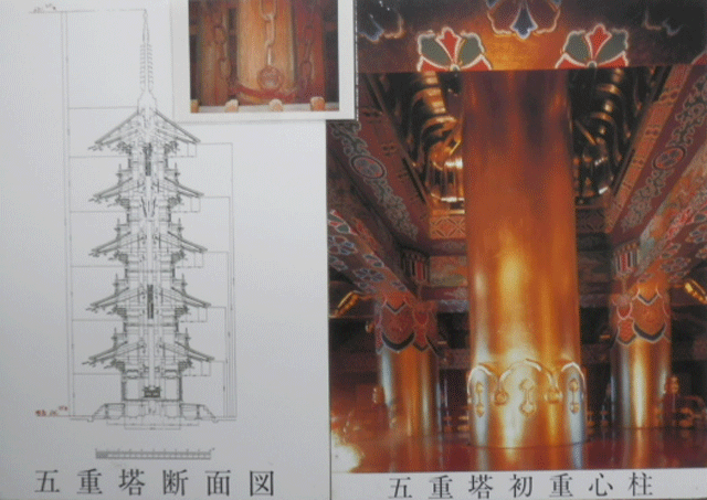 なお、日光の五重塔の心柱は吊り下げ構法ですが法隆寺の五重塔のように根元を地下に埋めた堀立柱もあるとの事です。